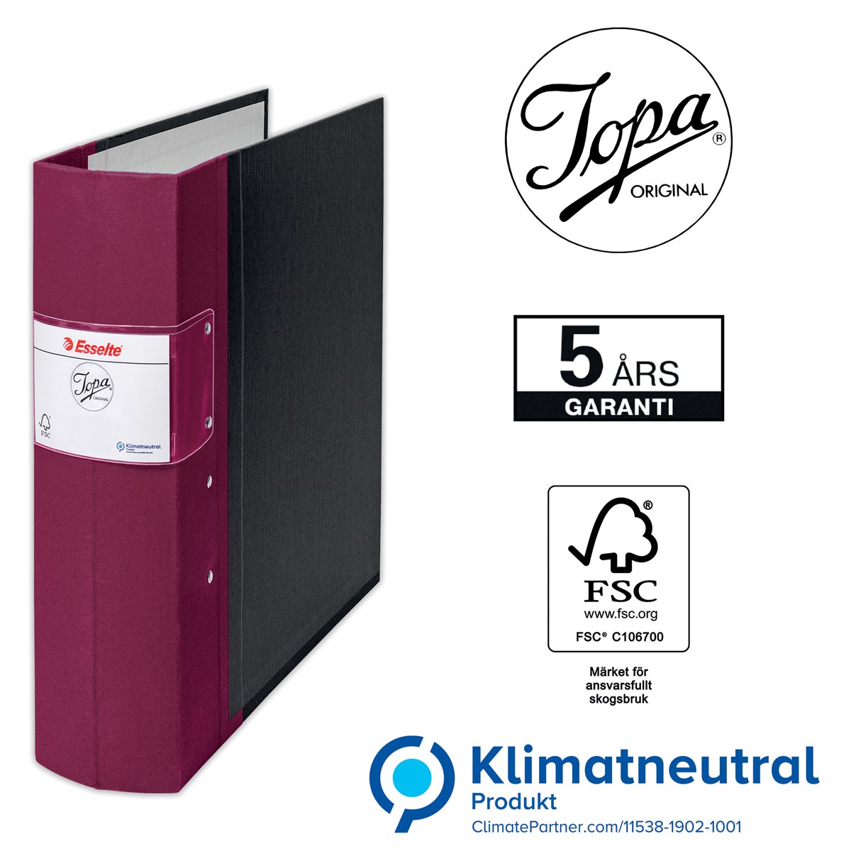 Esselte Jopa är en svensk uppfinningsrikedom i sitt original. Tillverkades redan 1889. Som världens första klimatneutrala träryggspärm blir de låga koldioxidutsläppen ännu lägre genom pågående lean-initiativ. (Läs mer: climatepartner.com/11538-1902-1001). Dessutom är alla träbaserade delar i pärmen godkända av The Forest Stewardship Council (FSC).