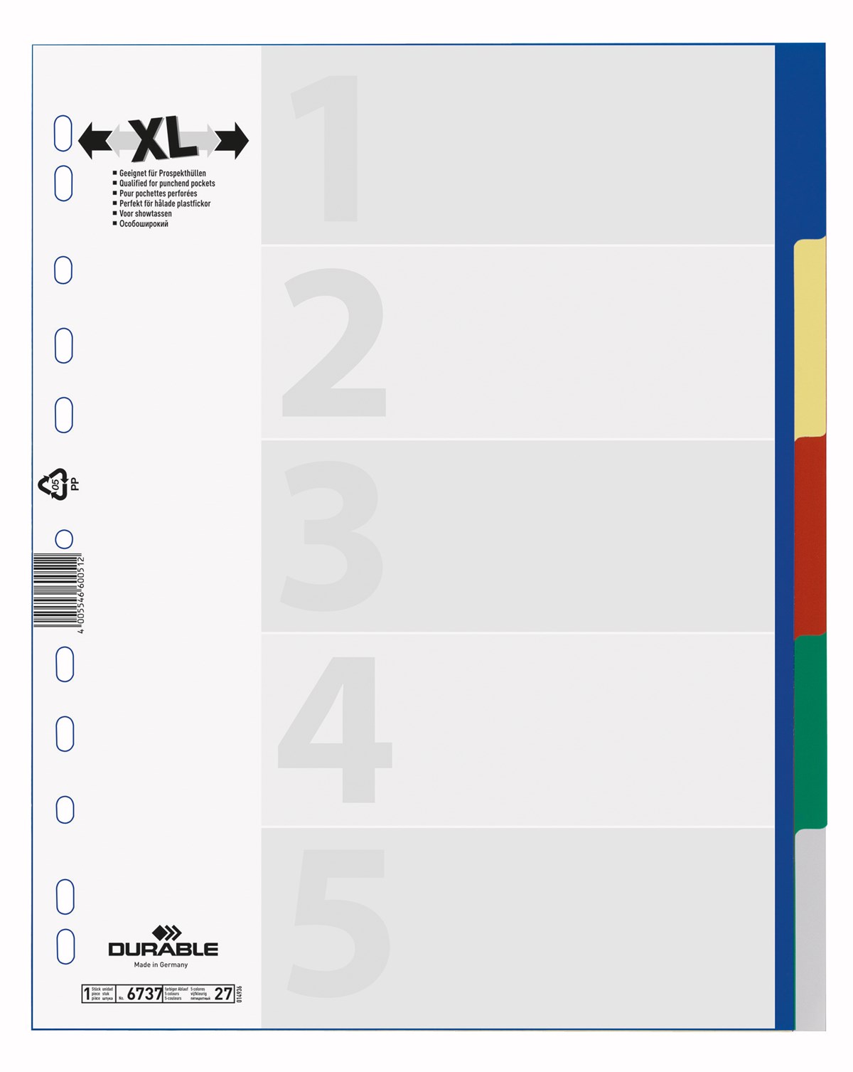 Otryckt pärmregister i PP-plast med olikfärgade blad samt försättsblad av kartong. Extra breda, kan därför användas tillsammans med underregister eller plastfickor. Multihålade. 20 st/förp.