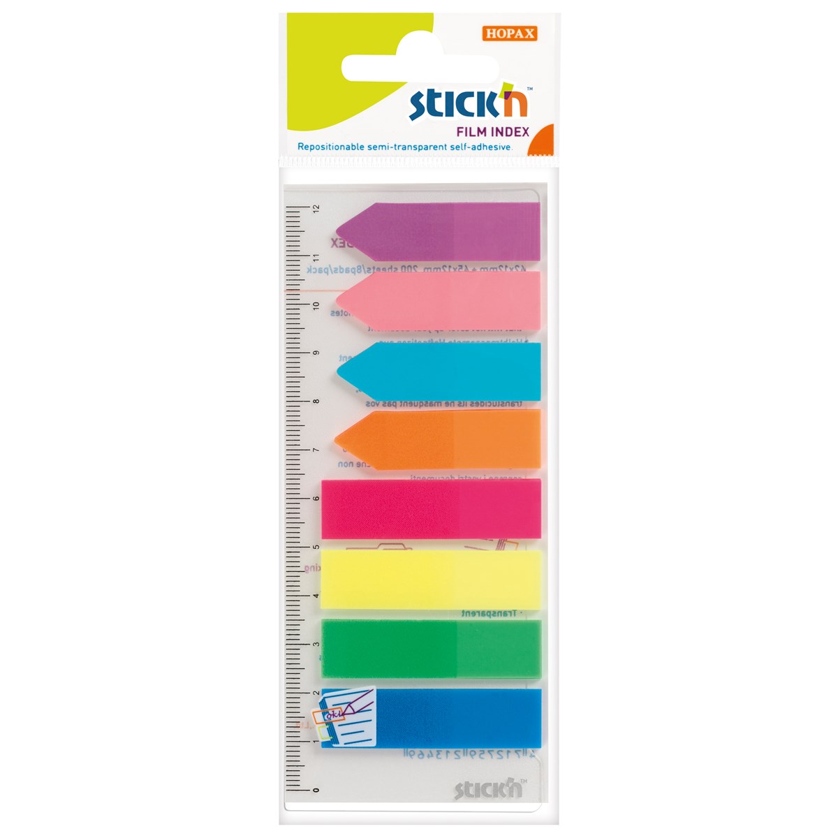 Indexflikar i PP som lätt fästes på papper eller annat som du vill hitta snabbt. Fliken lämnar inte märken efter sig och är lätt att ta bort. Varje flik är 45 x 12 mm. 200 flikar i halvtransparenta neonfärger. 4 av färgerna har flikar som är formade som pilar. Linjal på 12 cm medföljer. 24 st/förp.