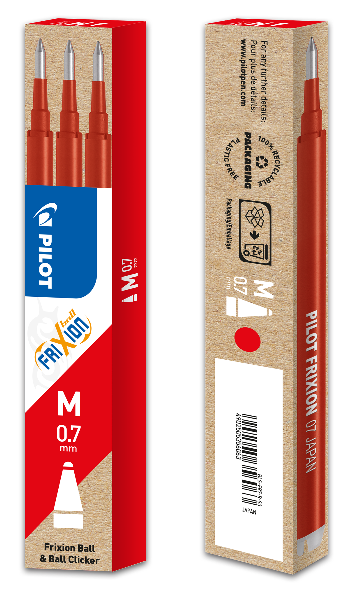 Alla Frixion-pennor är påfyllnadsbara, vilket betyder att du inte behöver köpa en ny penna när bläcket är slut. Med refills sparar du pengar istället för att köpa nya pennor, och samtidigt är det fantastiskt miljövänligt. Passar Pilot Frixion Ball, Frixion Clicker och Pilot LX. 3 st/förp.