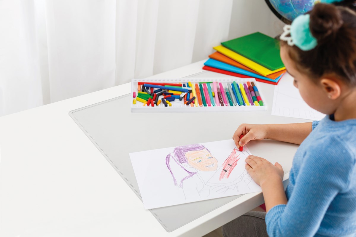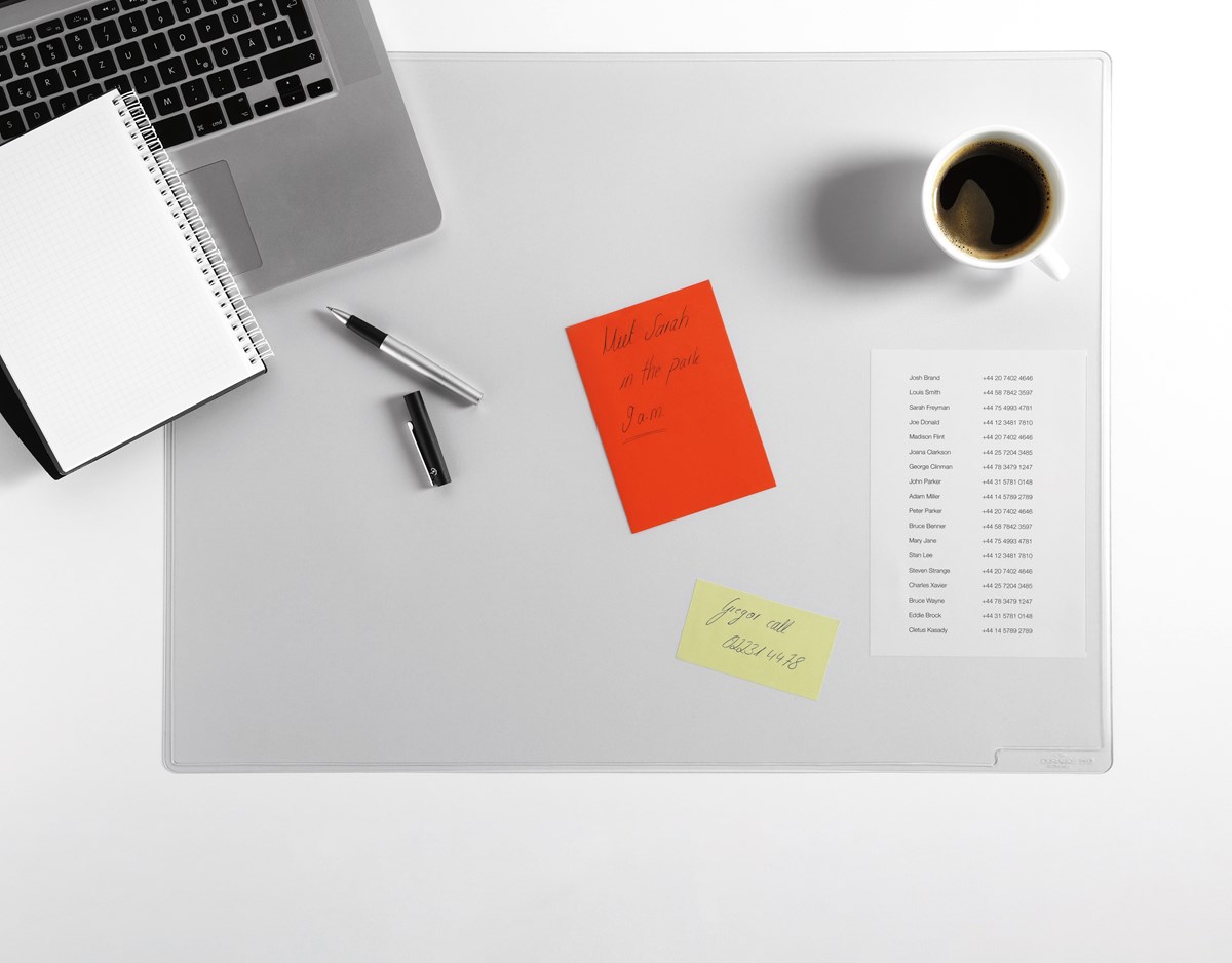 Skrivvänligt med matt/transparent specialplast med antiglidyta. Skyddar men döljer inte ett vackert skrivbord. Tillverkad i PVC.