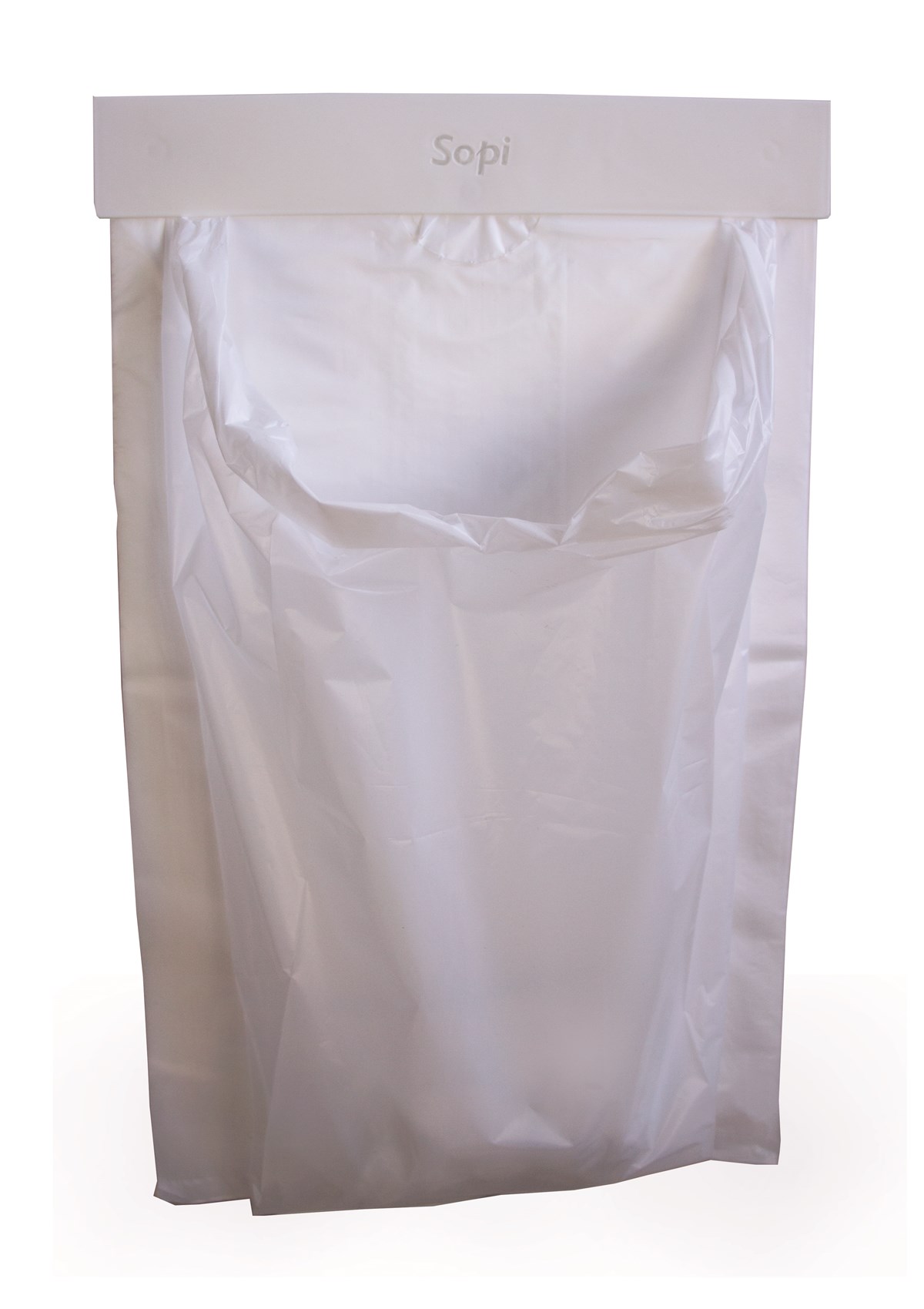 Sopi är en smidig papperskorgslösning med blockade påsar och plastryttare som fästs på en metallhållare. När påsen är full, dras den av med ett enkelt ryck. Sopi passar perfekt på tåg, i bussar, bilar och kontorsmiljöer. Mått: 215/150x350 mm. Tjocklek: 0,020 mm.