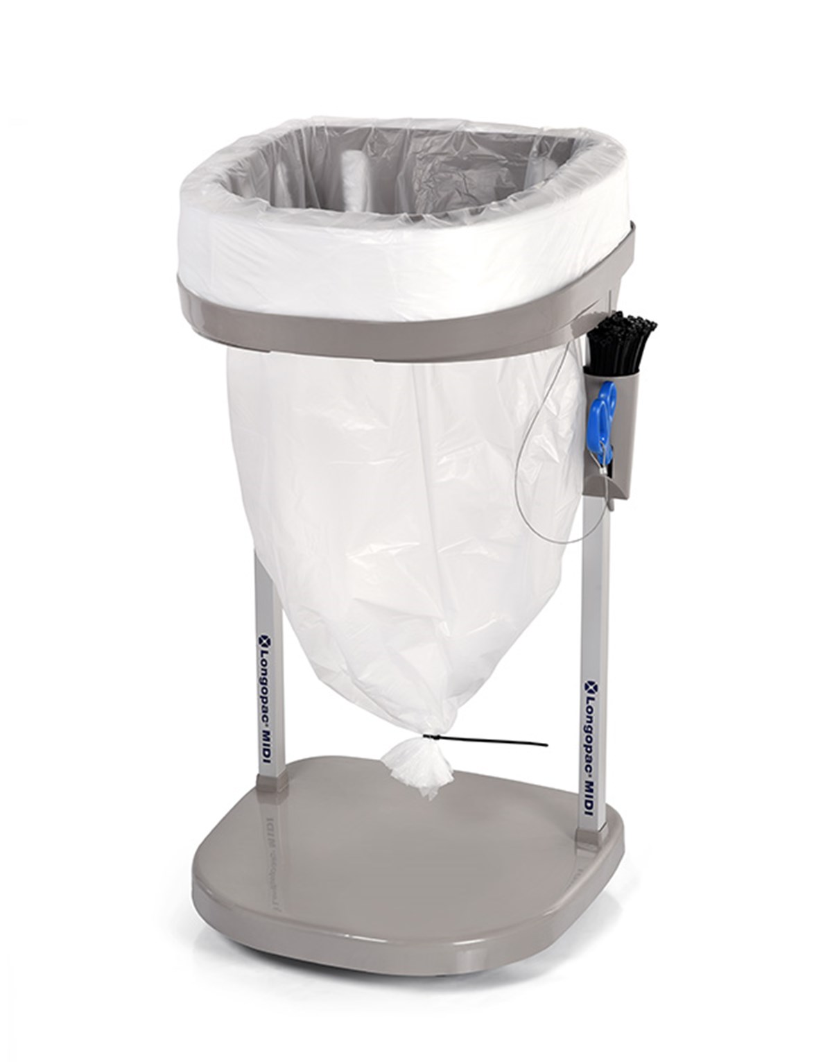 Ett golvställ för en mer hygienisk hantering då byte och förslutning sker från säckens utsida – ingen kontakt med avfallet. Mått H x B x D: 1055 x 650 x 595 mm. Inkastöppning: 330 x 340 mm. Laddas med säckkassett Longopac Midi.