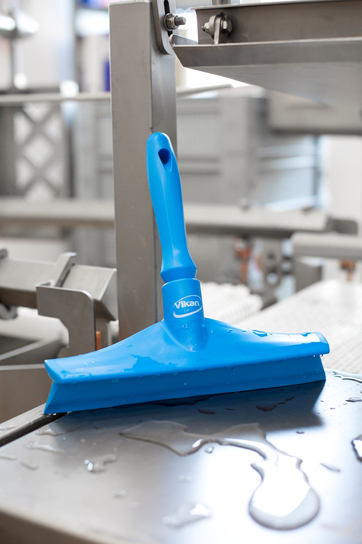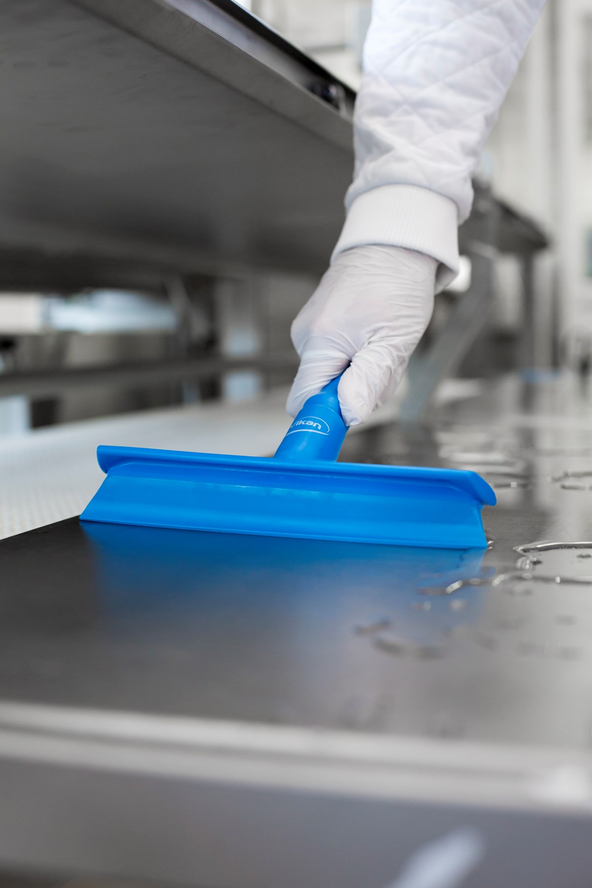 Ultrahygienisk skrapa med enkelt blad för att ta bort överflödigt vatten och livsmedelsrester från beredningsytor. Det mjuka och flexibla bladet är helgjutet för att säkerställa att det är lätt att hålla helt rent.