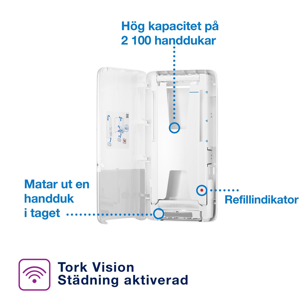Utformad för högtrafikerade toalettutrymmen. Rymmer 2100 handdukar. Snabb utmatning och enkel att fylla på. Refillindikator visar när det finns en halv bunt kvar (ca 200 handdukar). Mått: (H x B x D) 73 x 37 x 10 cm.