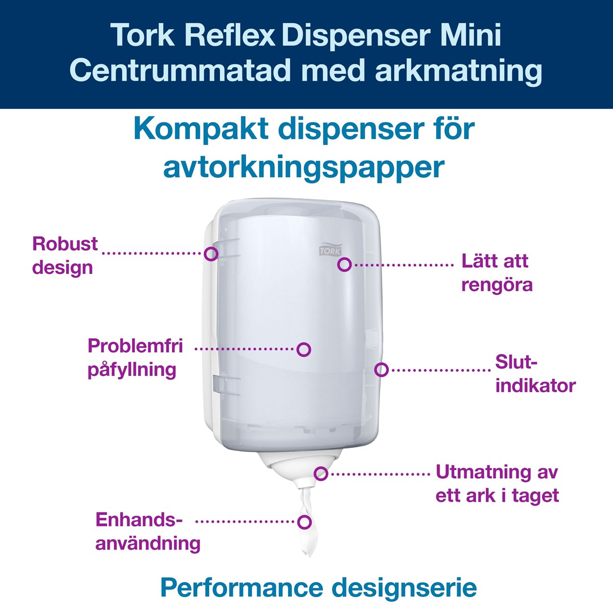 Minskar korskontaminering då användare endast vidrör det som de själva använder Hållbar, kompakt lösning som sparar plats Ekonomiskt arkmatningssystem Tork slutindikator möjliggör effektiv påfyllning
