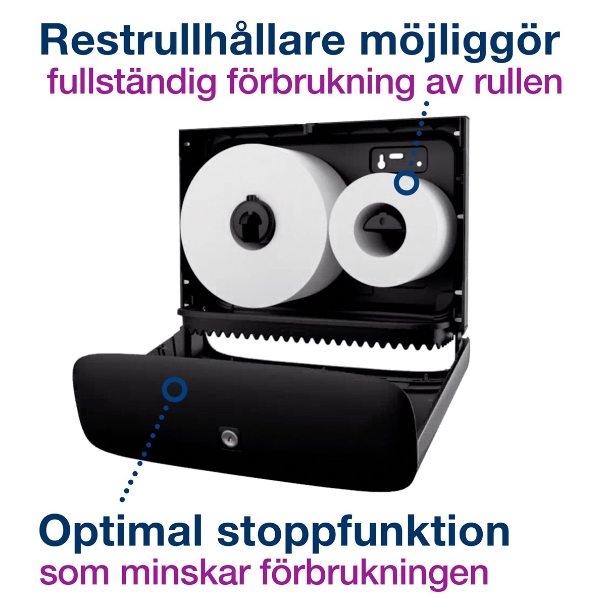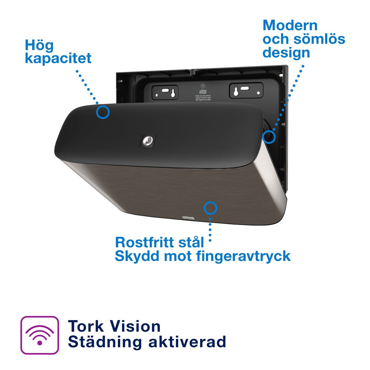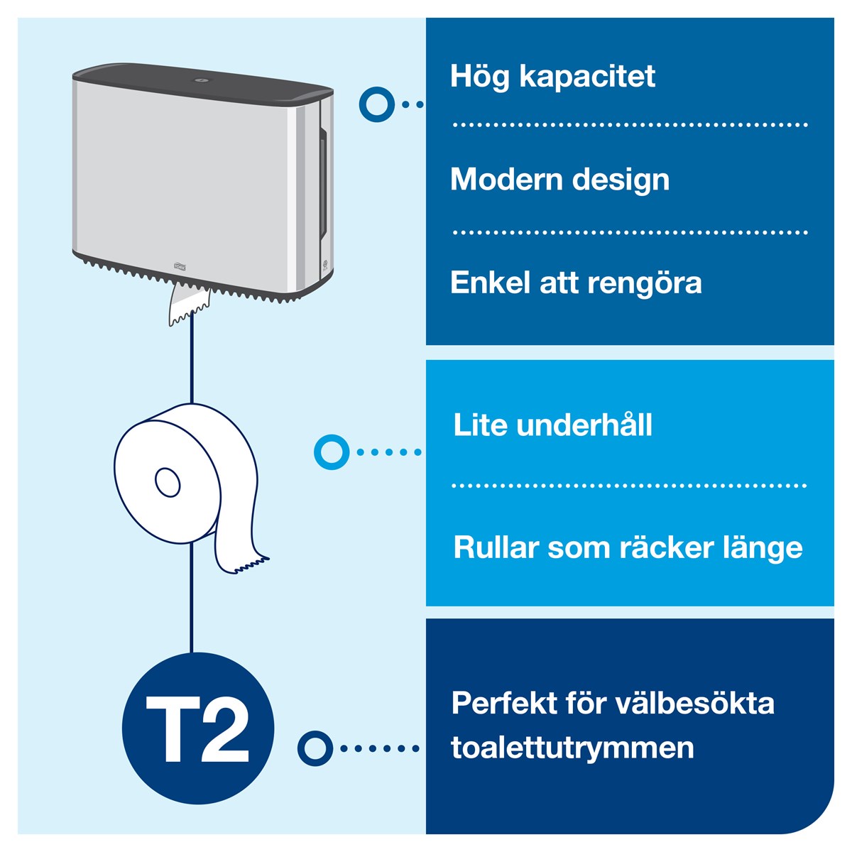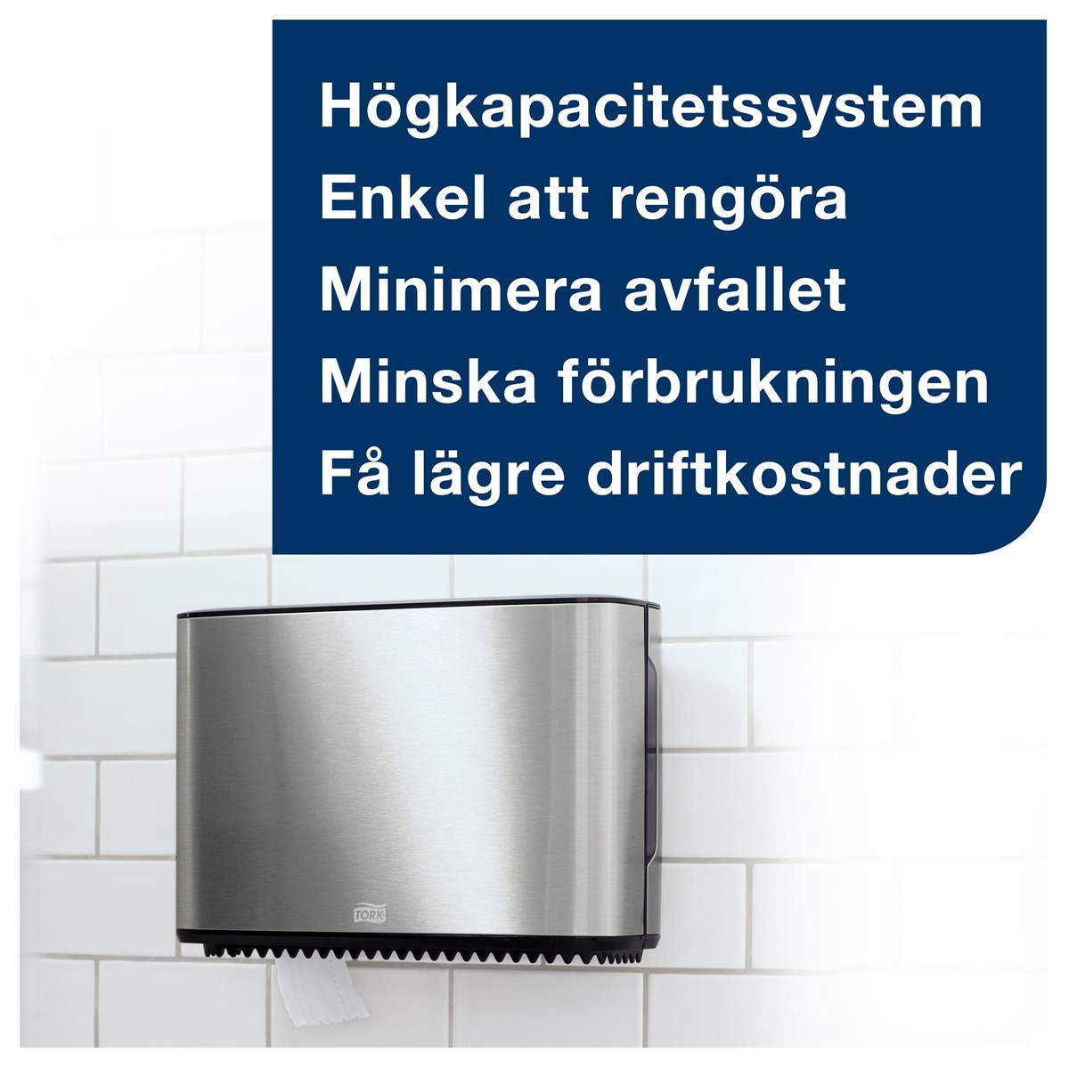 Modern och stilren design i rostfritt stål Hög kapacitet som minskar underhållstiden Sluten dispenser för förbättrad hygien Optimal rullbroms och rullhållare för restpapper som minimerar avfallet