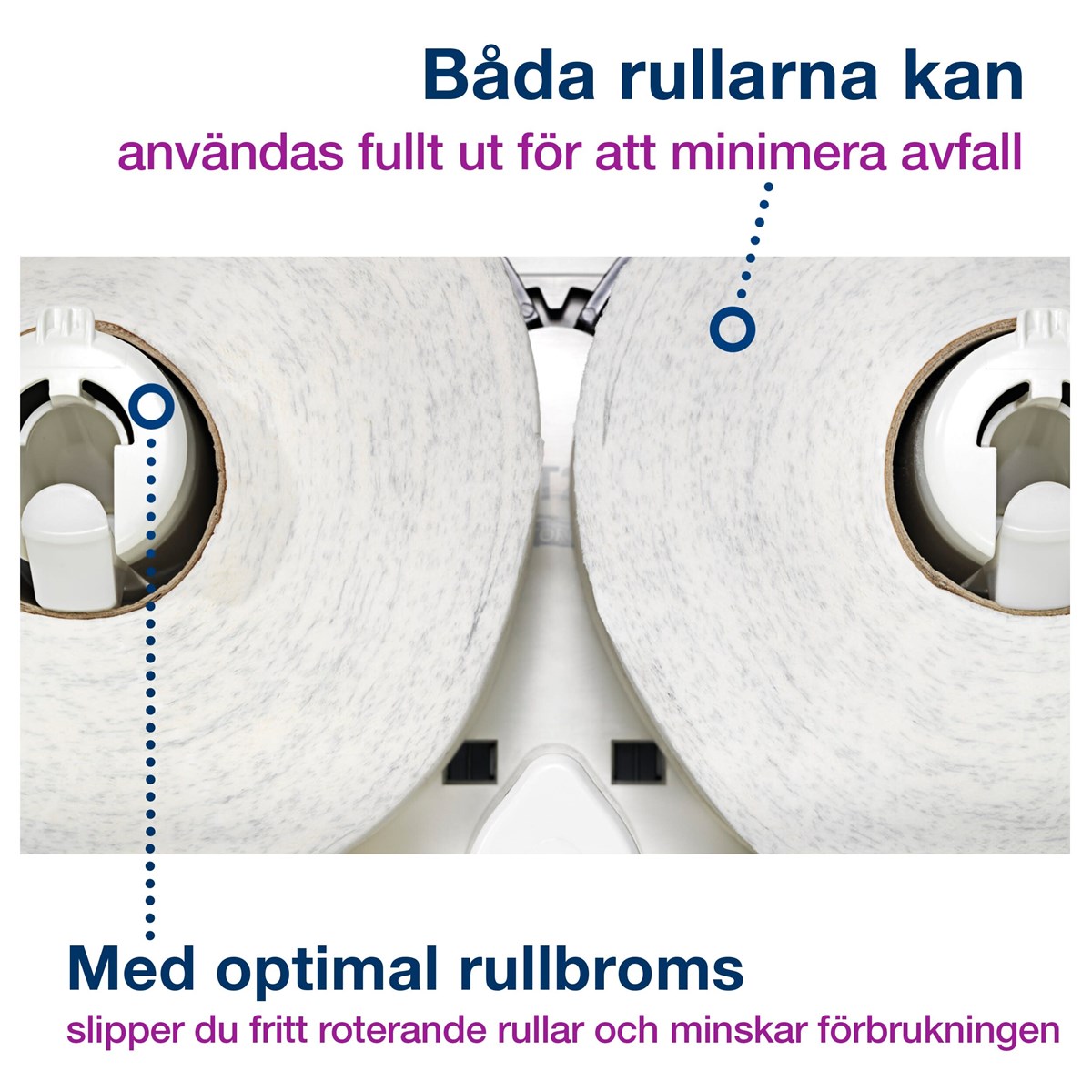 För välbesökta toalettutrymmen Sluten dispenser som skyddar rullarna och förbättrar hygienen Hög kapacitet för färre påfyllningar Optimal rullbroms minskar förbrukningen Använd båda rullarna fullt ut för att minska avfallet