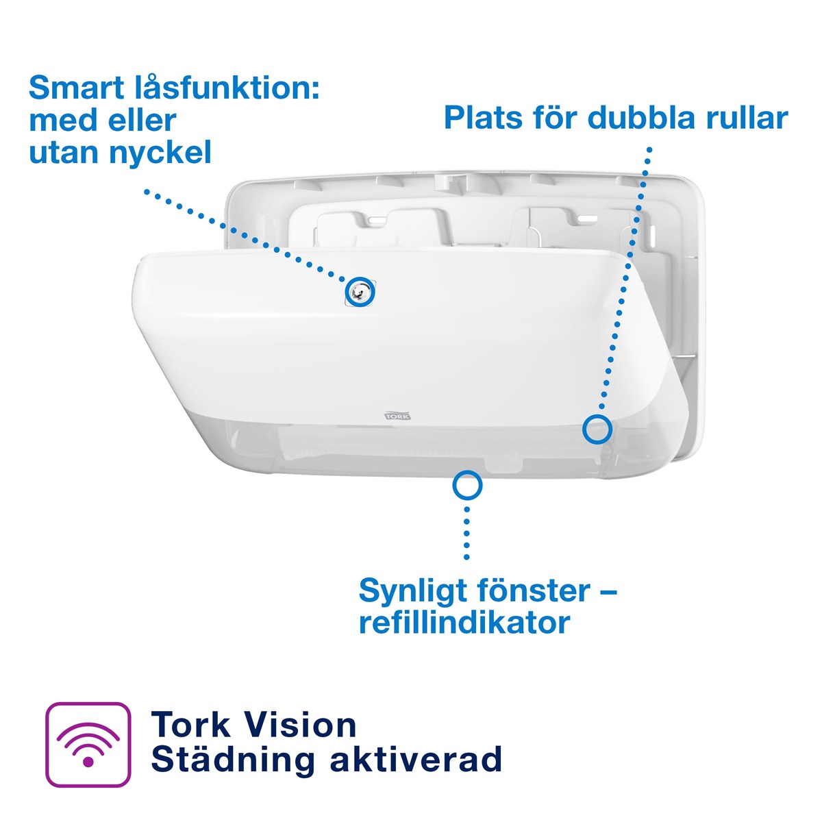 För välbesökta toalettutrymmen Sluten dispenser som skyddar rullarna och förbättrar hygienen Hög kapacitet för färre påfyllningar Optimal rullbroms minskar förbrukningen Använd båda rullarna fullt ut för att minska avfallet