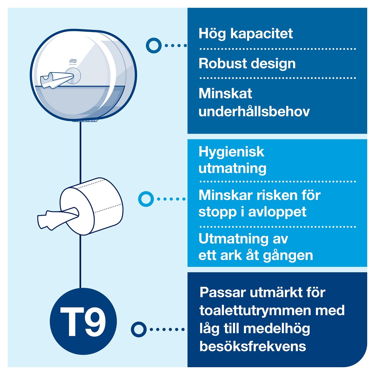Robust och modern dispenser För krävande toalettutrymmen med låg till medelhög besöksfrekvens Hygienisk utmatning av ett ark i taget minskar förbrukningen Hög kapacitet för färre påfyllningar Låsfunktion som skyddar rullarna