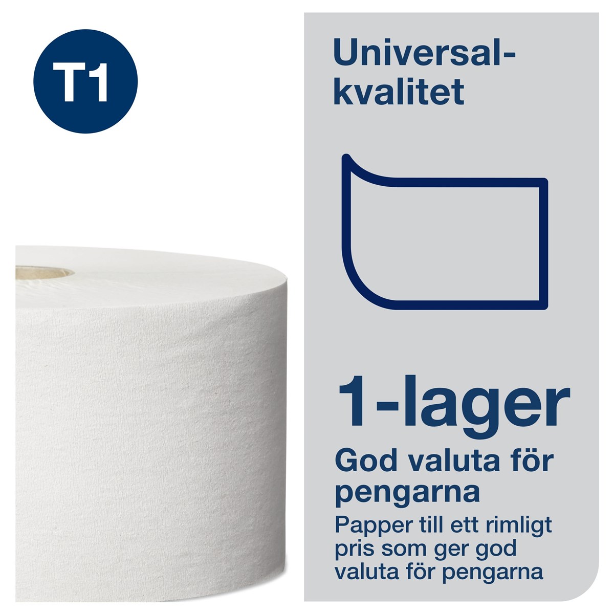 Systemet Tork Jumbo innebär effektivt utnyttjande av tiden och minskade kostnader och erbjuder mycket mer toalettpapper än standardrullar. Tork Universal Jumbo toalettpapper med 1 lager tillgodoser de grundläggande behoven i ett toalettutrymme, erbjuder bra värde för pengarna och är lämpligt för platser med hög besöksfrekvens.